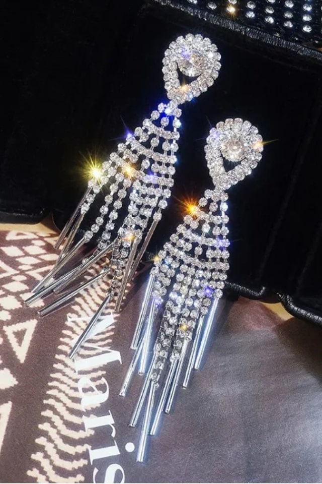 Elevate your elegance with these Silver Tassel Design Rhinestones Drop Earrings. Expertly crafted, they feature shimmering rhinestones that catch the light beautifully, paired with delicate tassels for a sophisticated movement. Perfect for adding a refined sparkle to evening wear or special occasions, these earrings combine timeless design with modern flair.